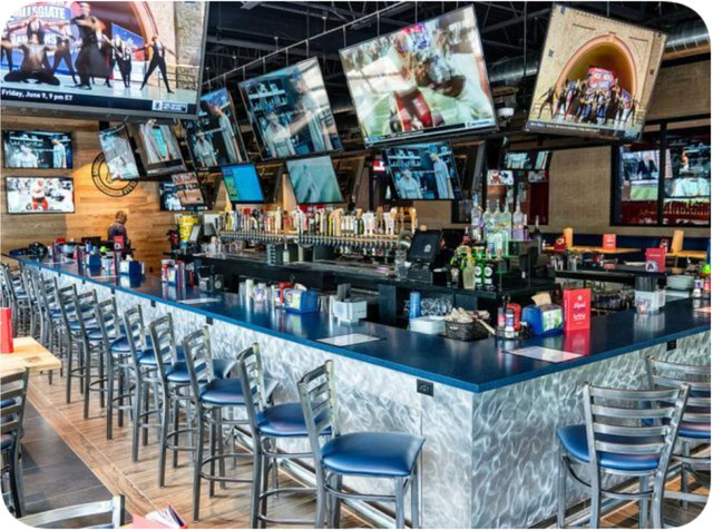 For a sports bar, you’ll need a good number of high-quality TVs with bright screens and minimal glare to handle the lighting conditions. Consider a mix of sizes and technologies (LED, LCD, QLED) to suit different areas, and ensure proper mounting and wiring for a clean look. Don’t forget about sports packages with a variety of channels, including local, regional, and national networks, as well as premium options like NFL Sunday Ticket.